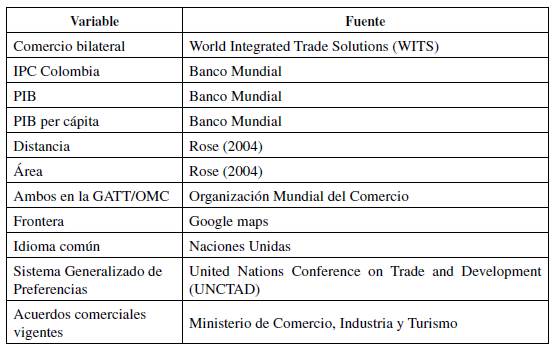 En la revisión del estado del arte del modelo gravitacional de comercio, se identificaron dos tipos de bases de datos usadas para determinar los efectos de un TLC sobre el comercio. El primero utiliza el comercio bilateral como un promedio de importaciones y exportaciones entre los socios o alguno de estos flujos (importaciones o exportaciones); son estimados por mínimos cuadrados ordinarios (MCO) (Cárdenas y García, 2005; Rahman y Dutta, 2012; Rose, 2004), panel de datos, en algunos casos con efectos aleatorios (Abedini y Peridy, 2008; Baier y Bergs-trad, 2006; Peridy, 2005) y otros con efectos fijos (Institute for International Trade, 2015; Sally y Siddique, 2014). En el segundo grupo, que analiza el comercio desde la perspectiva del importador y del exportador, los autores coinciden en el uso de efectos fijos independientes para el importador y el exportador (Carrere, 2006; Dutt et al., 2013; Eicher y Henn, 2011; Gil-Pareja et al., 2016; Roy y Rayhan, 2011) y, recientemente, se adopta un estimador Poisson de máxima verosimilitud (Esteve et al., 2019; Martin y Pham, 2019; Santos y Tenreyro, 2006; Timsina y Culas, 2019).