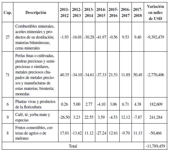 La Tabla 6 muestra la variación de las principales exportaciones de Colombia a Estados Unidos año a año durante la vigencia del TLC; la última columna es la sumatoria de las variaciones (aumento suma y reducción resta) de las exportaciones de los cinco capítulos principales. De estas cifras, podemos identificar que los combustibles y aceites minerales, piedras preciosas y frutas fueron los principales afectados por la reducción en el comercio durante el periodo.