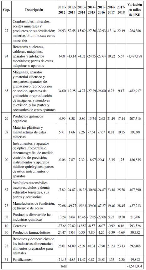 Comparando las pérdidas por disminución de las exportaciones según los capítulos analizados, Colombia fue el país que resultó más perjudicado. Ello se debe a que, de 2011 a 2018, sus exportaciones cayeron en 11,8 mil millones de USD y para Estados Unidos las pérdidas ascienden a USD 1,5 mil millones.