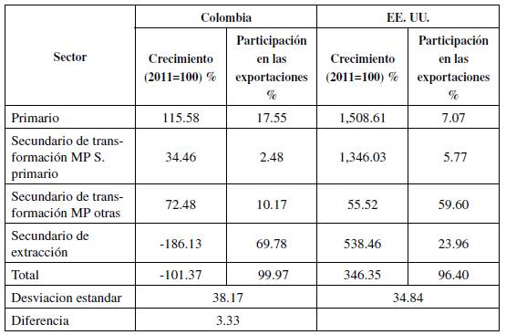Según la intensidad del comercio, las exportaciones de Colombia están fuertemente concentradas en el petróleo y otros minerales, mientras que las propias de Estados Unidos lo están en el sector secundario de transformación de otras materias primas diferentes a las provenientes del sector primario (los principales capítulos están detallados en la Tabla 6). Los porcentajes de participación de los sectores en las exportaciones presentan mayor desviación estándar para Colombia y la diferencia de puntos porcentuales ocurre entre el primer y segundo sector con mayor participación de 42,5, mientras para Estados Unidos esta diferencia es de 36 puntos porcentuales. Esta marcada concentración para Colombia, expone al país a desequilibrios económicos sujetos al precio del petróleo.
