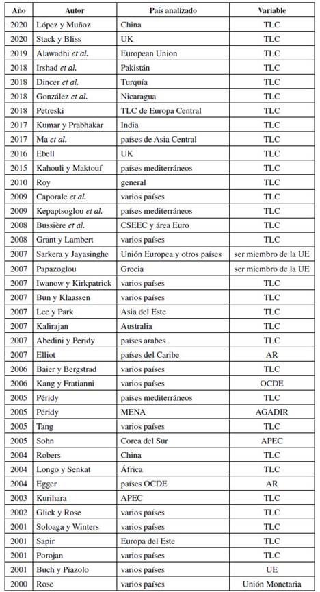 Tabla A1: Publicaciones que emplearon el modelo gravitacional para estimar los efectos de un acuerdo regional sobre el comercio del 2000 al 2020