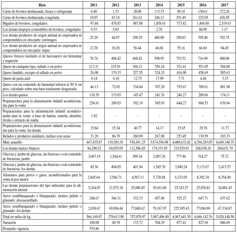 Para presentar resultados que incluyan las importaciones de los artículos libres de arancel (las cuales corresponden al resultado de restar de las importaciones totales las importaciones bajo contingentes), desde la entrada en vigor del tratado comercial con Estados Unidos, se determina su variación promedio durante el periodo analizado para los contingentes de 2012 a 2017 frente a 2011. Finalmente, se grafican los resultados para visualizar el aumento o reducción de comercio, según el origen de los artículos.