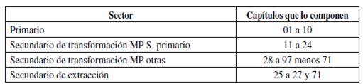 Los 95 capítulos arancelarios fueron clasificados en dos sectores: el primario y el secundario. Este último, a su vez, se dividió en tres subsectores: (1) el secundario de transformación de materias primas pertenecientes al sector primario, (2) el secundario de transformación de otras materias primas y (3) el secundario de extracción.