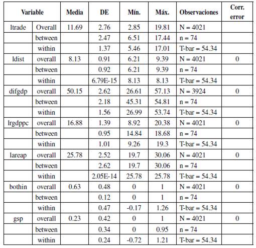 Para la estimación del modelo se empleó el software estadístico Stata. Como se mencionó en la sección de datos, los faltantes de información en los primeros años de la muestra hacen que el panel no esté balanceado. Sin embargo, Stata permite trabajar cómodamente con cualquier conjunto de datos panel, balanceados o no balanceados (Baum, 2006, p. 47). En todo caso, es importante aclarar que los datos faltantes no se correlacionan con algún factor inobservable que influya en la suspensión del comercio entre los países, por tanto, la selección muestral no causa estimadores insesgados.