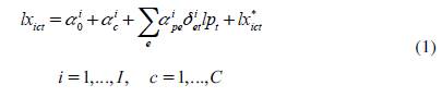 Donde I es el número máximo de variables endógenas laborales por analizar; C es el número máximo de cohortes; lx ict es logaritmo de la i-ésima variable laboral; α i 0 es una constante, α i c representa el efecto fijo de cada cohorte; δ et es una variable dummy con valor 1 para cohortes con edad e en el tiempo t; lp t es el logaritmo del precio del petróleo; α 1 pe recoge el efecto del logaritmo del precio del petróleo sobre el logaritmo de la i-ésima variable laboral para cohortes de edad e; y lx* ct es un término residual.