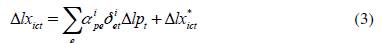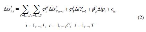 Además, si se nota que el multiplicador dinámico βi p indica cómo reacciona la variable filtrada Δlx* ict . ante un cambio de una unidad en Δlp , entonces, el cambio total en la variable Δlx ict . ante un cambio de una unidad en Δlp t puede estimarse según se muestra en la ecuación (4).