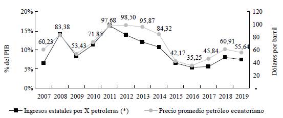 En Ecuador, las exportaciones de petróleo son primordiales para los ingresos estatales. En efecto, desde 2007, los ingresos obtenidos por el Estado ecuatoriano, por la vía de las exportaciones petroleras, han representado 6-16 % del PIB del país, con etapas de altos ingresos (particularmente en 2010-2014) y bajos ingresos (como 2009 y en 2015-2019). Dichos ingresos muestran una tendencia muy similar a los precios promedio reconocidos al petróleo ecuatoriano (correlación lineal de 0,92; Figura 1).