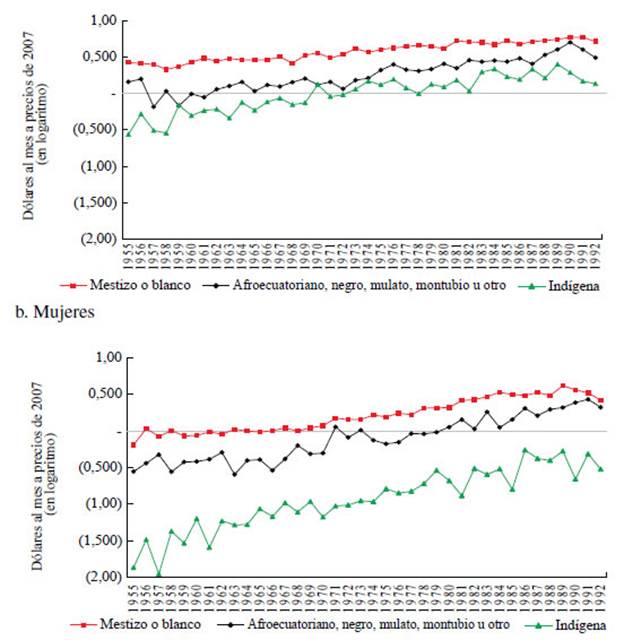 Así, en el caso del ingreso laboral real, se notó que, tanto para hombres como para mujeres, los grupos autoidentificados como "mestizos o blancos" tienden a percibir los ingresos más altos, seguidos por "afroecuatorianos, negros, mulatos, montubios u otros" y, al final, con los ingresos más bajos, se ubica la población "indígena"9. En cuanto a la comparación por sexo, persiste la tendencia de que los hombres obtengan ingresos laborales mayores que las mujeres, en particular, las mujeres "indígenas" son el grupo más perjudicado. Otro patrón destacable es una tendencia general al aumento del ingreso laboral real para las nuevas generaciones (Figuras 6a y 6b).