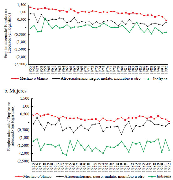 Con respecto a los efectos cohorte sobre la ratio empleo adecuado-no adecuado, se encontró, igualmente, para hombres y mujeres que los grupos "mestizos o blancos" tienden a alcanzar mayor proporción de empleo adecuado; seguidos por "afroecuatorianos, negros, mulatos, montubios u otros". Ello deja a los grupos "indígenas" con la proporción más baja (equivalente a la proporción más alta de empleo inadecuado). Se notó también que las mujeres son relegadas al empleo no adecuado con mucha más fuerza que los hombres. De nuevo, el grupo de mujeres "indígenas" es el más perjudicado. Por su parte, en términos generacionales, se encontró una ligera tendencia a que las cohortes más jóvenes alcancen una menor proporción de empleo adecuado (Figuras 7a y 7b).