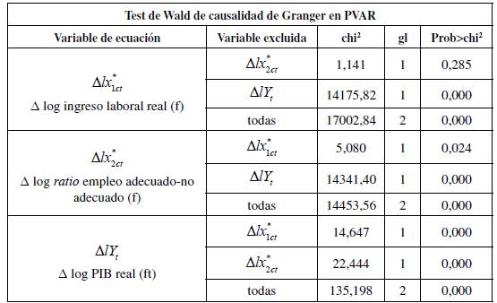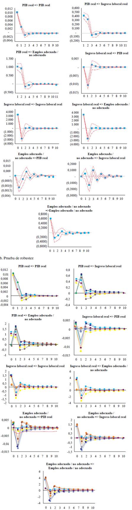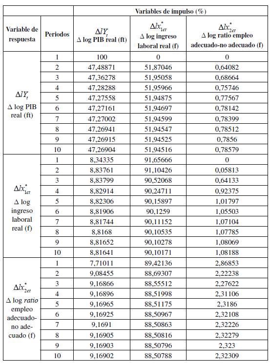 Luego de estimar el PVAR, se estableció un orden de las variables endógenas para aplicar la descomposición de Cholesky. Como apoyo para identificar dicho orden, se empleó la prueba de Granger (Tabla 6), la cual sugirió con un 95 % de confianza una posible relación causal que va del ingreso laboral real hacia la ratio empleo adecuado-no adecuado, junto con posibles simultaneidades entre PIB real y ratio empleo adecuado-no adecuado, y entre PIB real e ingreso laboral real, las cuales no permitieron definir claramente una dirección de causalidad. Tales resultados llevaron a asumir que la variable más endógena del sistema es la ratio empleo adecuado-no adecuado (causada en el sentido de Granger por el ingreso laboral real).