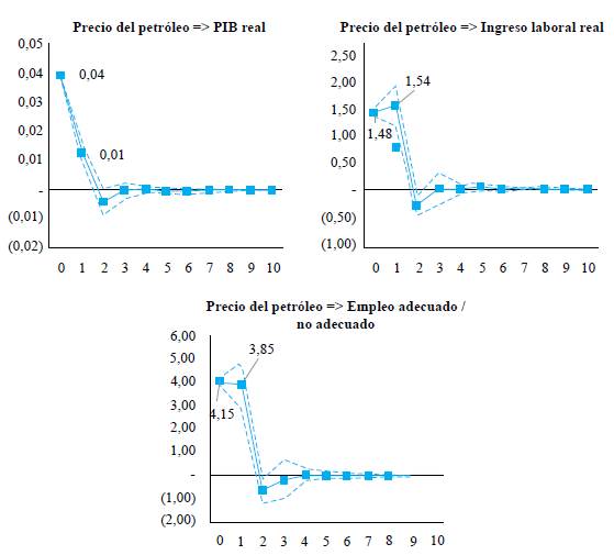 Luego de estimar las desigualdades estructurales asociadas a los efectos cohorte y efectos petróleo-edad, se filtraron tales efectos en el ingreso laboral real y en la ratio empleo adecuado-no adecuado, y se usaron esas variables filtradas para estimar el PVAR presentado en el segundo modelo, incluyendo al PIB real como variable macro endógena y al precio del petróleo como variable exógena.