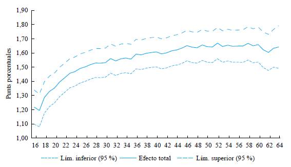 Figura 13: Efecto total por edades de un shock en el precio del petróleo sobre la ratio empleo adecuado-no adecuado