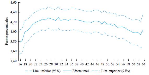 Donde y i pe es el efecto total de un aumento de una unidad en la primera diferencia del logaritmo del precio del petróleo -lo cual se aproxima a un incremento de 1 % en el nivel de dicho precio- sobre la variable laboral i en cohortes de edad e. Aquí, se asumió que el precio del petróleo influye tanto en términos macro (multiplicadores dinámicos βi p estimados por PVAR) como en términos micro, al combinarse con la desigualdad laboral que sufre cada grupo de edad (efectos petróleo-edad α i pe estimados por MCP).