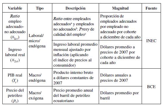 Estos criterios generaron un panel sintético de 2966 observaciones, no fuertemente balanceado, al cual se agregó información macro del BCE. Construida la base de datos, se aplicó la estrategia empírica explicada en esta sección sobre las siguientes variables: ratio entre empleo adecuado y no adecuado por cohorte (x 1cl ) (en adelante, ratio empleo adecuado-no adecuado); ingreso laboral promedio real por cohorte (x 2ct ) (en adelante, ingreso laboral real) como variables laborales micro; PIB real (Y) como variable endógena macro; y precio promedio anual del petróleo ecuatoriano (P¡) como variable exógena (Tabla 1).