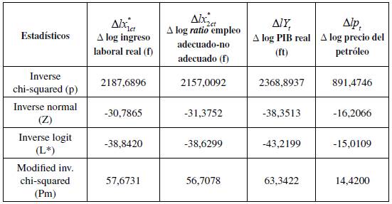 A estas variables, expresadas como la primera diferencia de su logaritmo, se les aplicó la prueba de raíz unitaria de tipo Fisher (basadas en la prueba ADF), obteniendo que casi en todas se rechazó la hipótesis nula de que los paneles poseen raíz unitaria10, excepto con la primera diferencia del logaritmo del PIB real a la cual fue necesario filtrar su tendencia temporal para rechazar la hipótesis nula (Tabla 2).