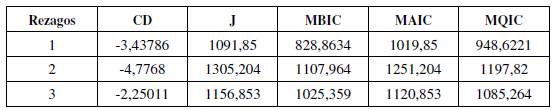 Por su parte la estabilidad del modelo se verifica revisando que los valores propios de la matriz compañera del sistema dinámico (ecuación 2) se encuentren dentro del círculo unitario (Hamilton, 1994). Hechas estas evaluaciones, puede estimarse el PVAR por MGM, lo que garantiza resultados consistentes y con normalidad asintótica cuando las variables son estacionarias (Abrigo y Love, 2016; Arellano y Bover, 1995; Hansen, 1982). El número de rezagos S del modelo se define minimizando los criterios de selección y momentos en MGM -análogos a los criterios de información- sugeridos por Andrews y Lu (2001) a partir de Hansen (1982).