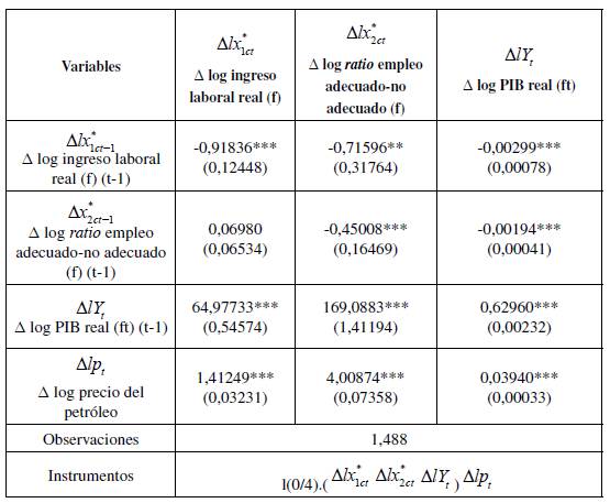 También con el PVAR, se estimaron funciones de multiplicadores dinámicos (FMD) que indican cómo las variables endógenas reaccionan ante shocks de una unidad en la variable exógena (Lütkepohl, 2005). Como en el PVAR el precio del petróleo es exógeno, precisamente sus multiplicadores dinámicos estiman el efecto de un shock en dicho precio sobre las variables laborales filtradas Δlx* ict . y sobre las variables macro ΔlYt. Finalmente, dado que el modelo de cohortes presentado en la ecuación (1) puede escribirse en primeras diferencias, obtenemos la ecuación (3).