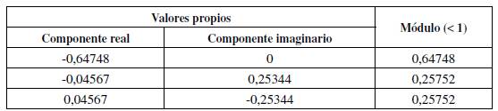 Una vez se posee evidencia a favor de la estacionariedad de todas las variables del modelo, se nota que los criterios de selección bayesianos, Akaike y HQ y el estadístico J de Hansen se minimizan con un solo rezago (S = 1; Tabla 3), de modo que se estimó un PVAR con un rezago11 (Tabla 4). En esa estimación, destacó que solo un coeficiente no es significativo a un nivel de confianza de 95 %; también destacó que el modelo es estable, pues sus valores propios caen dentro del círculo unitario (Tabla 5).