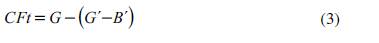 De la ecuación (2), se despliega la necesidad de entender que CFt consiste en la variación de existencias. Esta calcula la inversión en el propio equipo, y está definida por G', que representa el valor de este capital, si no se hubiera comprado, menos el gasto generado para sostenerlo o haberlo usado, como se representa en la ecuación (3).