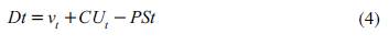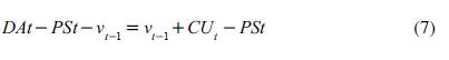 Una vez que se resuelve la ecuación (1) para incorporarla en la (2), se asume que DA, CU t y v t _ x son valores conocidos, de los cuales tenemos información. De ello se obtiene PSt, el cual es un valor que, generalmente, no es calculado dentro de la información de cuentas nacionales. Por tanto, lo despejamos: