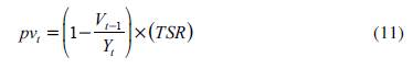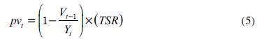 Para definir la tasa de plusvalía (ecuación 5), se realizó un quiebre con la teoría tradicional tanto de la línea ortodoxa clásica23 como de la marxista clásica24. Aquí, se propone que el análisis de la plusvalía es fruto de la producción, consumada en el intercambio, y su relación con los salarios. Por ello, la tasa de plusvalía en el periodo t viene dada por la relación entre el capital variable del anterior periodo t -1 (el salario pagado por los capitalistas) y el total de producción consumada en el intercambio en el periodo t, frente al tiempo de materialización de la inversión en el consumo25.