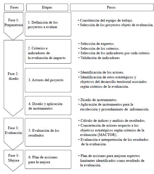 Para cumplir con el objetivo, se diseñó una metodología estructurada en fases y etapas, que integran los criterios de impacto, pertinencia, eficiencia, eficacia, sos-tenibilidad y el análisis de la concertación de actores. Todo ello, se hizo para poder evaluar con integralidad y rigor científico la percepción del impacto de los proyectos de desarrollo local de tipo económico en el desarrollo territorial de la provincia Cienfuegos, desde la perspectiva de los actores involucrados, considerando retos y objetivos estratégicos asociados.