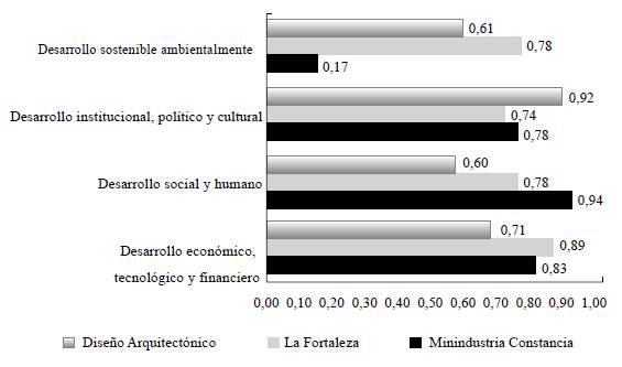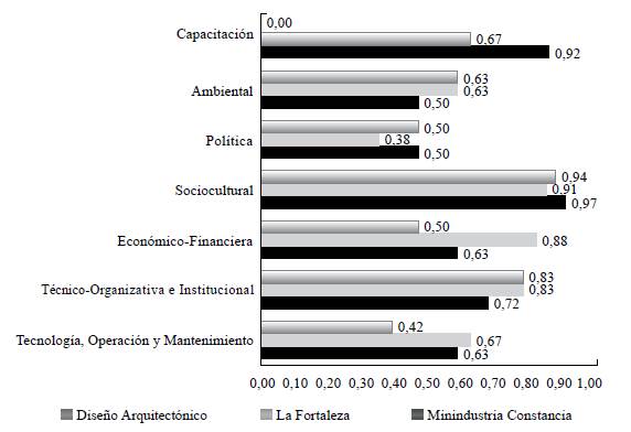 Con respecto al criterio de sostenibilidad, la Figura 4 explica el comportamiento en las dimensiones de tecnología, operación y mantenimiento; técnico-organizativa e institucional; económico-financiera, sociocultural; política; ambiental y capacitación; según valores de los índices relativos por dimensiones del criterio sostenibilidad (IRSD) de cada una para los tres proyectos. Ello determina los valores medios, en los tres casos, del índice relativo de sostenibilidad (IRS): 0,75 para la Minindustria; 0,77 para la Fortaleza y 0,65 en el caso de Diseño Arquitectónico (Tabla 1).
