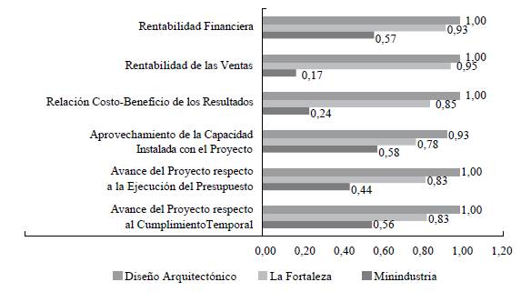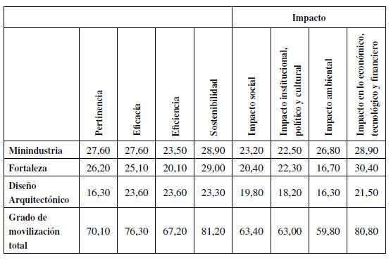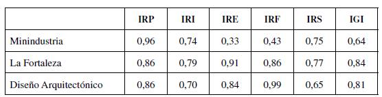 Al observar la Tabla 1, es posible precisar que la Fortaleza obtiene el mayor índice global de impacto (IGI), dado que logra un resultado más uniforme en todos los índices relativos, entre valores medios y altos. Le sigue Diseño Arquitectónico, que muestra los resultados más desfavorables en su sostenibilidad. Por último, la Minindustria se afecta sensiblemente en su eficacia y eficiencia.