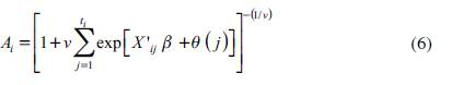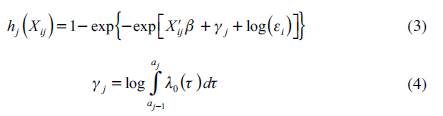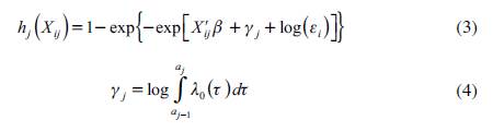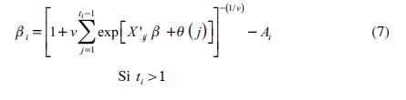 Sea una muestra de empresas que entra a cese de actividades en un mes j determinado. A continuación, denótese con h ¡j la tasa de riesgo mensual discreta de la empresa ¡ en el mes j. Sea X u un vector de covariantes entre los cuales están los periodos que lleva en el mercado, si tiene cartera de clientes que le permita apalancarse una serie de periodos, si tiene sucursales y si es una microempresa. La tasa de riesgo mensual discreta vendrá dada por las ecuaciones (3) y (4).