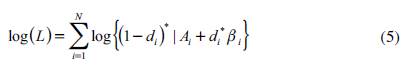 Donde e ¡ sigue una distribución gamma, con media unitaria y varianza σ 2 = v; y 7 j es el logaritmo de la integral del riesgo básico sobre el intervalo relevante α j . La función de verosimilitud en logaritmos tiene la expresión (5).
