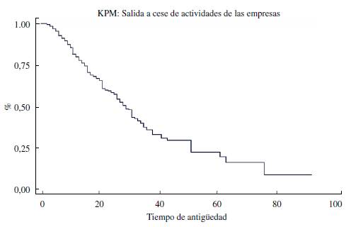La Figura 1 muestra que las empresas que llevan más tiempo constituidas resisten más tiempo antes de salir a un cese de actividades. Es decir, las empresas que llevan alrededor de cinco años (60 meses) tienen una probabilidad del 20 % de salir a cese de actividades.