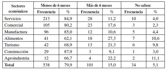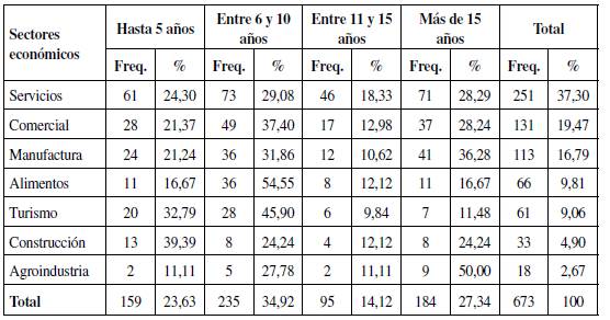 Un análisis de los sectores económicos, según la longevidad de las empresas, muestra un claro patrón en la distribución de estas mipymes. Salvo para el sector constructor, la proporción de empresas crece hasta el rango de los 6-10 años; decrece en el quinquenio posterior; para crecer nuevamente en la etapa final. Lo anterior refleja la importancia de alcanzar la etapa de desarrollo en el ciclo vital de las empresas. En tal sentido, el 45 % de las empresas había logrado superar los primeros siete años de antigüedad, con proporciones que van desde el 28 % (agroindustria) hasta 65 % (alimentos o turismo).