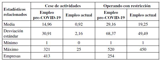Un análisis estadístico del nivel de empleo en riesgo de acuerdo con el estado de la operación de las empresas se resume en la Tabla 3.