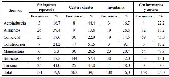 Como se observa en la Tabla 5, cerca del 20 % de las empresas no tenía inventarios ni cuentas por cobrar al momento de ser consultadas. Dentro de estas empresas, las pertenecientes a los sectores turismo (41 %) y alimentos (39,4 %) fueron los más afectados.