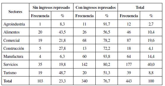Tabla 5: Distribución de las empresas por sectores económicos según opciones de ingresos represados