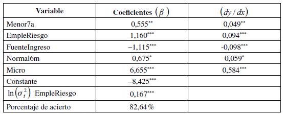 Con el fin de analizar la propensión al cese de actividades que presentaban las empresas en la muestra, se estimó un modelo de elección discreta probit con hete-rocedasticidad (hetprobit)9, el cual es una generalización del modelo probit estimado por máxima verosimilitud. Siguiendo la notación y lineal argumental de Harvey (1976), el hetprobit modela la varianza como una función multiplicativa de estas m variables regresoras heterocedásticas z i =(z 1i , z 2i ,…, z mi ),,como se muestra en la ecuación (1).