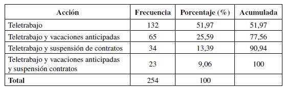 Al analizar las acciones tomadas por las empresas que lograron continuar su operación con algún tipo de restricción (Tabla A1 del Anexo), se pudo constatar que en su totalidad (254 empresas) se realizó bajo la modalidad de teletrabajo o trabajo en casa4. Sin embargo, un poco más de la mitad (52 %) lo había hecho de manera exclusiva. Las otras medidas adoptadas, en combinación con la modalidad de trabajo en casa son vacaciones anticipadas (25,6 %) y suspensión de contratos (13,4 %). El 9 % había aplicado las tres modalidades de restricción conjuntamente.