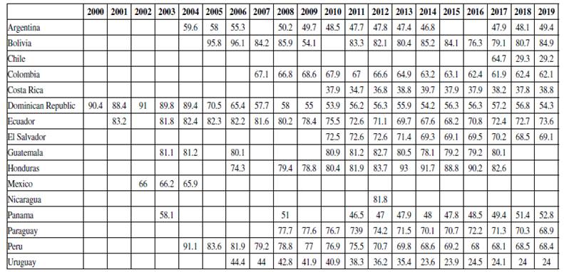 Table 1: Informal employment rate (%) in Latin America 2000-2019