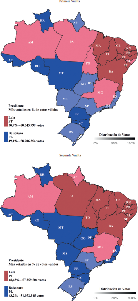 El 2 de octubre de 2022 se realizaron los primeros comicios presidenciales cuyos resultados favorecieron a Lula y Bolsonaro. De acuerdo con el TSE, el primero obtuvo la mayor votación con 57,2 millones, seguido de los 51 millones del candidato del PL, los 4,9 de Tebet y los 3,5 de Gomes. Un análisis general de la distribución de votos para los dos primeros candidatos muestra que el Nordeste y el Sudeste fueron enclaves electorales dominantes que le otorgaron, por un lado, 21,6 millones al PT frente a los 8,7 del PL, y por otro, 23,4 millones al PL en contraste con los 21 millones para el PT. Con relación a la región del Sur, hubo una diferencia entre los 9,5 del PL y los 6.4 millones del PT. En términos de geolocalización discursiva en el desarrollo del ciclo electoral (en presente y futuro), esto debe comprenderse como un asunto estratégico tanto para la administración pública de los biomas y sus reservas energéticas, como para la ampliación de las bases electorales en el nivel municipal, estatal y federal.