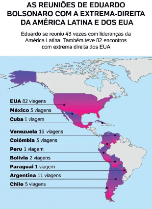Segundo um levantamento realizado pela Agência Pública junto ao Uol e outros 18 veículos latino-americanos e cinco organizações especializadas em investigação digital, sob a liderança do Centro Latinoamericano de Investigação Jornalística (CLIP), Eduardo Bolsonaro participou desde 2018, de ao menos 43 reuniões com lideranças da ultradireita de países da América Latina como México, Venezuela, Chile, Bolívia, Argentina e Colômbia. A isso se somam mais de 80 reuniões que Eduardo manteve com influentes membros da ultradireita americana desde 2018, mapeados pela Pública. Alguns desses encontros geraram alianças duradouras que seriam ativadas em momentos-chave da tentativa de fomentar um golpe de Estado no Brasil a partir do questionamento sobre as urnas.