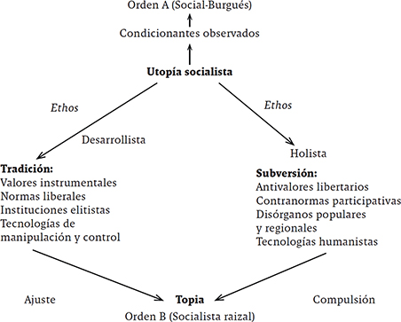 El esquema muestra un orden social de partida y un orden social utópico de llegada. El orden social A es una especie de síntesis, no totalmente armónica pero que goza de cierta estabilidad. Esa estabilidad está dada por la presencia de valores, normas instituciones y tecnologías. En este caso, ese orden social es el social burgués, nombre que Fals Borda le dio al orden posterior al Frente Nacional. En estricto sentido, este es el actual orden social neoliberal. Este orden neoliberal está regido por la eficiencia, la avaricia, el despilfarro, el consumismo, la acumulación, la competencia, la insolidaridad, la destrucción de la naturaleza; en él rigen instituciones que favorecen la lógica capitalista del mercado, minan la democracia y la soberanía. Orden secundado por medios masivos de comunicación e información que realizan el “manipuleo mediático” (2008, p. 275) y garantizan la estabilidad y reproducción del orden social vigente. En el seno de este orden social se presentan desequilibrios, conflictos, inestabilidades, etc., que minan su estabilidad y que muestran que frente a metas valoradas puede ser superado o dirigido hacia otra realidad posible. Aquí aparece la utopía, un concepto que Fals Borda asumió positivamente tal y como muestra en su ensayo Vigencia de utopías en América Latina (1992). Esa utopía le da dirección al cambio social o, mejor, le da dirección a la subversión6. La subversión, en este caso, está formada por solidaridad, fraternidad, libertad, igualdad, dignidad, autonomía, por valores democráticos y participativos; se acompaña de instituciones descentralizadas, que favorecen el autogobierno, la toma de decisiones, es decir, de contra-instituciones que cuestionan la lógica de las instituciones neoliberales. Asimismo, muestra que el ethos desarrollista y unilateral del capitalismo neoliberal puede destruirse y dar paso a un nuevo ethos donde prime lo cualitativo sobre lo cuantitativo, donde el holismo supere la mirada miope y reduccionista del capitalismo. En este cambio de orden social, las tecnologías humanistas, la recuperación del saber popular, de maneras propias de atender las necesidades, etc., son fundamentales. Ahora, el paso de un orden al otro no es, desde luego, evolutivo o mecánico, requiere ser direccionado. Esa dirección la da la utopía. En ese proceso es fundamental tener en cuenta lo que Fals Borda llama ajuste y compulsión. El primero sirve para hacer énfasis en “determinados puntos de vista” y la compulsión sirve para dar dirección y dinamismo al cambio7: