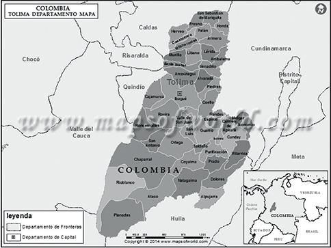 Figura 1.: Mapa político administrativo del departamento del Tolima. Elaborado a partir de http://espanol.mapsofworld.com/continentes/mapa-de-sur-america/colombia/tolima.html