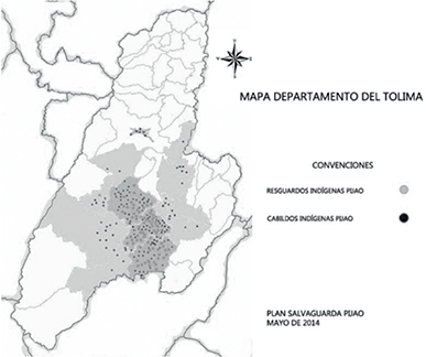 Figura 1.: Localización de las comunidades indígenas Pijao en el dpto. del Tolima. Elaborado a partir de información suministrada en el marco del Plan Salvaguarda Pijao 2014.