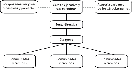 Sus instancias de autoridad eran esbozadas como: (a) el congreso que se reúne cada dos o tres años como máximo, lo conforman indígenas que discuten para la deliberación que se eligen de la siguiente manera: cinco delegados de cada comunidad cuentan con voz y voto. A su vez (b) el congreso es presidido por la Junta Directiva, quien es la que vela por el funcionamiento del movimiento indígena regional. Luego de que el congreso deja de sesionar, esta queda como máxima autoridad; se compone por noventa delegados oficiales, de los cuales cinco cuentan con voz y voto, todos se reúnen cada seis meses. La Junta Directiva tiene la responsabilidad de elegir y ser elegida para el Nuevo Comité Ejecutivo (que posteriormente se llamaría “Consejeros Mayores”). A esto le sigue (c) el Comité Ejecutivo, conformado por ocho miembros permanentes elegidos por la Junta Directiva. El organigrama de la organización era el siguiente (ver Figura 2):