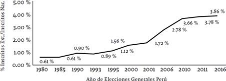 El padrón electoral para 2016 indicó 884.924 electores hábiles migrantes, los cuales representan 3.86% del electorado general (Jurado Nacional de Elecciones [JNE], 2016). En la Figura 1 se observa el crecimiento de la población electoral objeto del presente estudio en perspectiva histórica. Repasar esta estadística amerita la oportunidad de conocer más de cerca este electorado que ha venido siendo un actor importante en el desarrollo económico del país en las últimas tres décadas. El electorado exterior por mucho tiempo ha estado desarticulado de los recuentos históricos del Perú, y ha sido más que oportunista el tratamiento que le han dado los que toman las decisiones estratégicas del país.