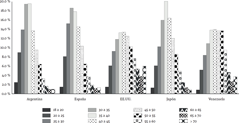 Figura 2.: Electores extranjeros (Argentina, España, EEUU, Japón y Venezuela) de las elecciones presidenciales 2006 primera vuelta según grupo etéreo. Tomado de “¿Cómo votan los peruanos en el exterior? Aproximaciones al heterogéneo electorado del exterior y al voto migrante” (Castillo, 2011).