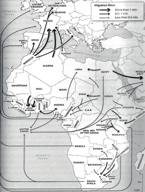 En cuanto a las pautas migratorias africanas, el mapa 1 muestra las orientaciones de estas migraciones hacia Occidente, Medio Oriente y en el interior de África entre los años 1970 y 2005; con una diferenciación entre las olas migratorias más voluminosas (superior a 1,000.000 de personas); y las demás (entre 300.000 y 1,000.000, e inferior de 300.000). Todo ello muestra la complejidad de estas migraciones africanas con vocación diaspórica, tal como lo hemos mencionamos anteriormente.