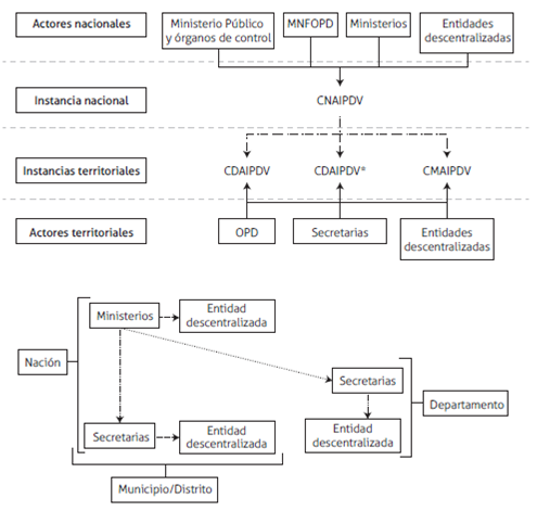 Como se observa en el gráfico 1, en el nivel nacional se encuentra el Consejo Nacional de Atención Integral a la Población desplazada -CNAIPDV-, el cual es