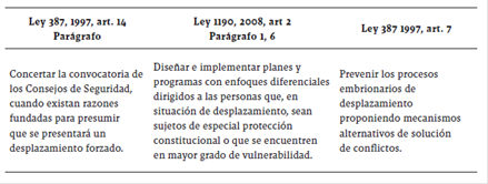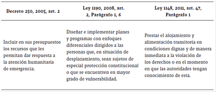 A partir de las leyes de víctimas y sus decretos reglamentarios, expedidas a partir de 1997 a 2012, así como los Conpes 3400 y el Decreto 250 de 2005 (adoptados para cumplir con las órdenes de la Corte Constitucional con ocasión de la Sentencia T-025 de 2004 y sus Autos de seguimiento), se perfilan las siguientes competencias para los gobiernos territoriales, en particular, y para las autoridades municipales: