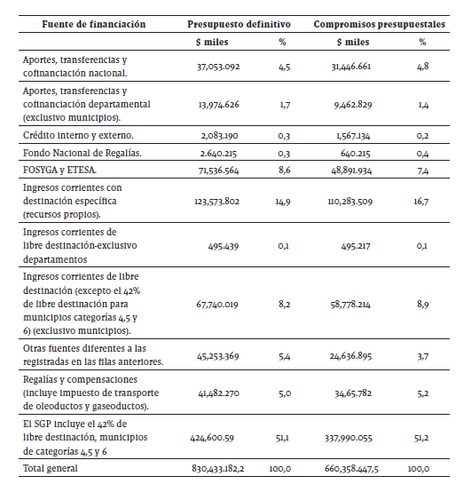 Como se deduce de los datos de la Comisión de Seguimiento, las tres principales fuentes del gasto territorial en población desplazada, tomando como eje los recursos efectivamente comprometidos, son: Sistema General de Participaciones con el 51,2%; se destaca, los Recursos propios de libre destinación: 16,7% y en tercer lugar están las regalías y compensaciones que corresponde al 5,2% del gasto total.